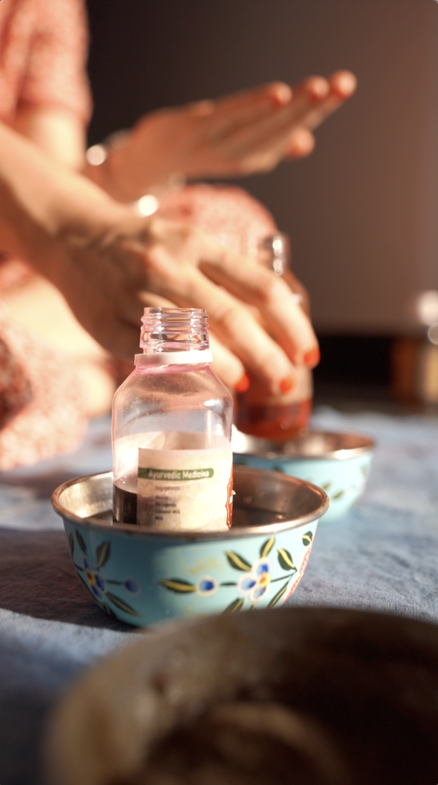 Het inmasseren van warme olie (soms ook Karna Abhyanga genoemd):